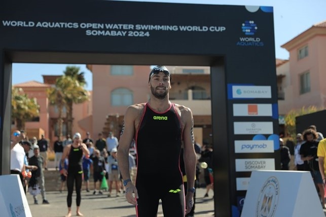 Nella prima giornata della prima tappa di Coppa del Mondo in svolgimento a Soma Bay, in Egitto, gli Azzurri conquistano i primi tre gradini del podio nella dieci chilometri (in copertina il podio). Ricomincia con un trionfo Domenico Acerenza, che aveva vinto l'ultima tappa dello scorso anno a Funchal che fu selezione per i mondiali di Doha. Il recente bronzo iridato della 5 km, campione europeo in carica della distanza, regola il gruppo allo sprint in solitario in 1h55'26" stavolta senza intralci come nell'intenso finale di Doha, trascinando il compagno Gregorio Paltrinieri (sotto), che è secondo in 1h55’28”90, dopo una gara tutta in rimonta condotta prima dalle retrovie e terminata da campione.